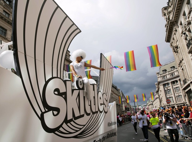 Limited edition white Skittles were handed out from a rainbow-less float during the Pride in London parade...